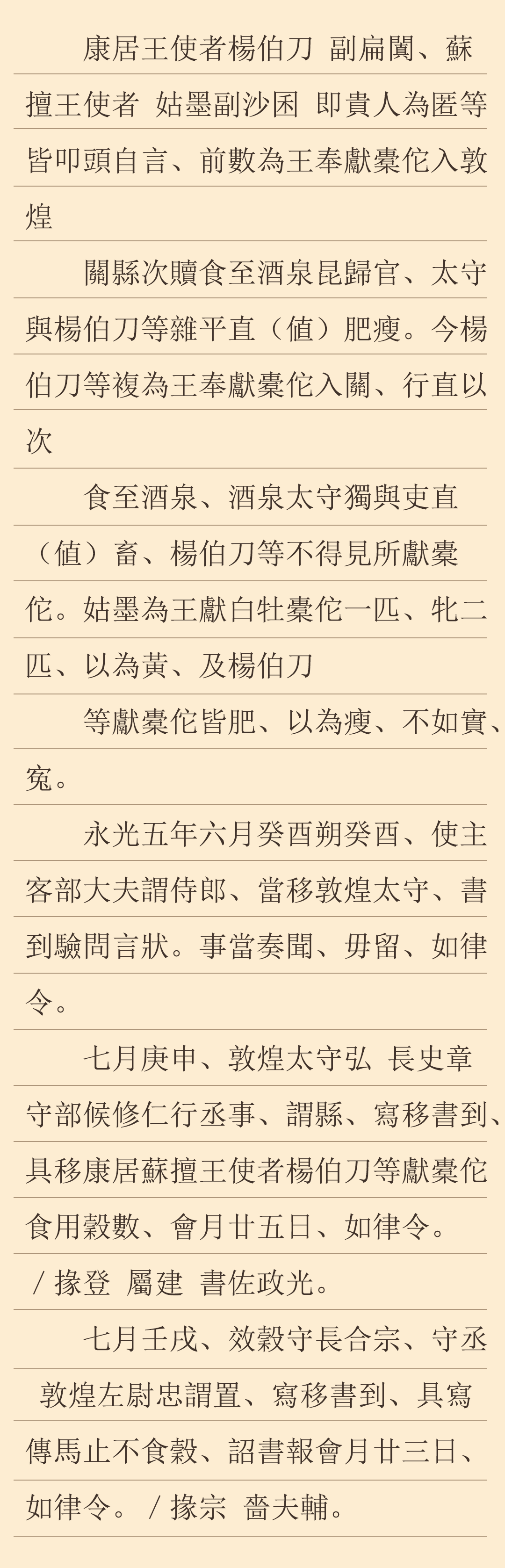 但是,這次獻(xiàn)貢物的情況卻與之前有所不同。當(dāng)康居王使團(tuán)從玉門關(guān)進(jìn)入敦煌境內(nèi),從敦煌到酒泉,沿途中沒有收到任何漢廷官員供應(yīng)的食物。到達(dá)酒泉后,酒泉太守和吏卒對(duì)其供奉的駱駝進(jìn)行評(píng)估時(shí),沒有通知康居王使者楊伯刀等其他朝貢人員到現(xiàn)場(chǎng)參加評(píng)估,僅漢廷官吏單方面對(duì)所獻(xiàn)的貢物進(jìn)行了評(píng)價(jià)。酒泉太守評(píng)價(jià)的結(jié)果與貢物的實(shí)際有較大的出入,使者楊伯刀帶來(lái)的駱駝本來(lái)是膘肥體壯的三匹白駱駝,可酒泉太守及其下屬卻定為羸瘦的黃駱駝。面對(duì)這不如實(shí)的評(píng)估結(jié)果,楊伯刀等人上告朝廷,申訴冤情。