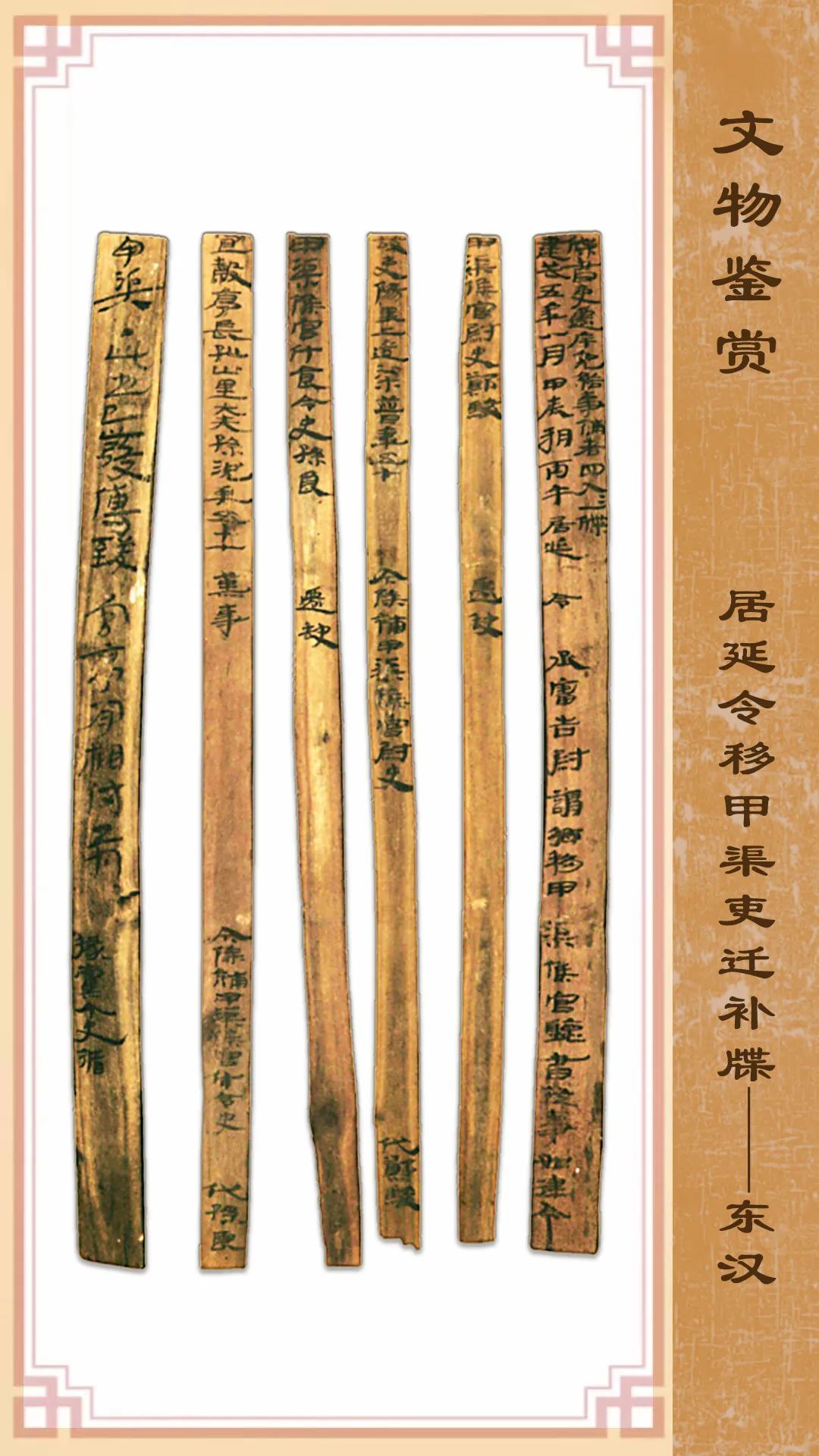 第一簡文字為:“牒書:吏遷、斥免、給事補(bǔ)者四人,人一牒。建武五年八月甲辰朔丙午,居延令 丞審告尉:謂鄉(xiāng)移甲渠候官,聽書從事,如律令。”這是文件的標(biāo)題和行文要求。“居延令”之后尚留空白,說明這是一份還未正式生效的官員任免文件。其他4簡則是此次任免人員和崗位的具體內(nèi)容。在簡牘背面書有此文件的起草人掾黨和令史循二人,屬于共同署名。該文書對了解漢代基層吏員的任免、除補(bǔ)等基本程式有重要參考價(jià)值?,F(xiàn)藏甘肅簡牘博物館。