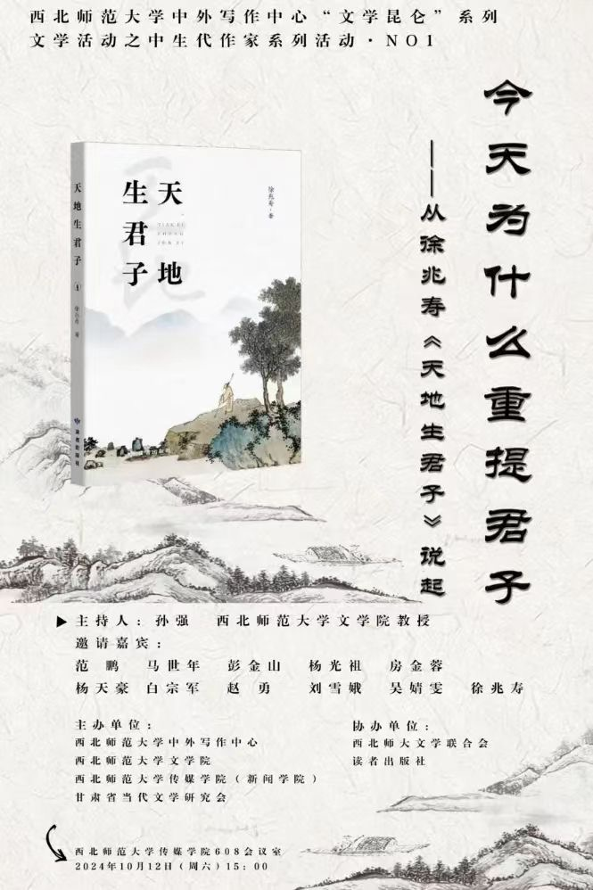 2024年10月12日,由西北師范大學(xué)中外寫作中心、西北師范大學(xué)文學(xué)院、西北師范大學(xué)傳媒學(xué)院、甘肅省當(dāng)代文學(xué)研究會聯(lián)合主辦的“文學(xué)昆侖”之中生代作家系列活動“今天為什么重提君子——從徐兆壽《天地生君子》說起” 徐兆壽《天地生君子》作品分享會在西北師范大學(xué)舉辦。