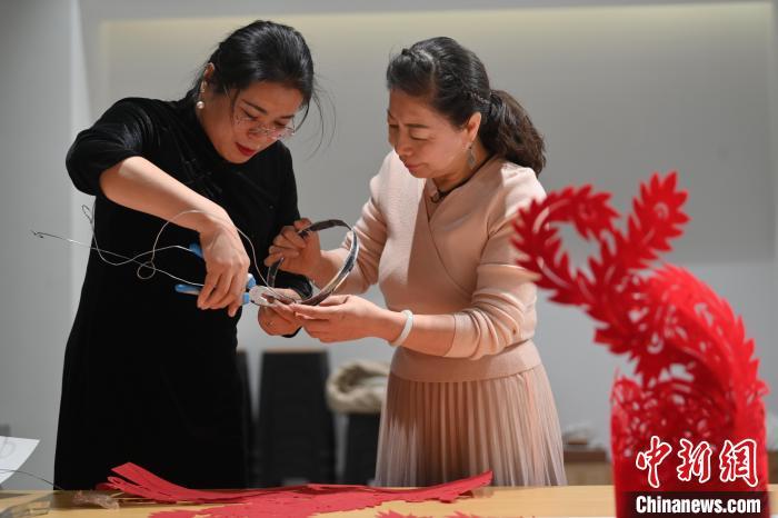 11月23日,甘肅省蘭州市楊樹珍剪紙工作室內(nèi),楊樹珍(左)帶領(lǐng)團(tuán)隊(duì)成員制作剪紙漢服。中新社記者 李亞龍 攝