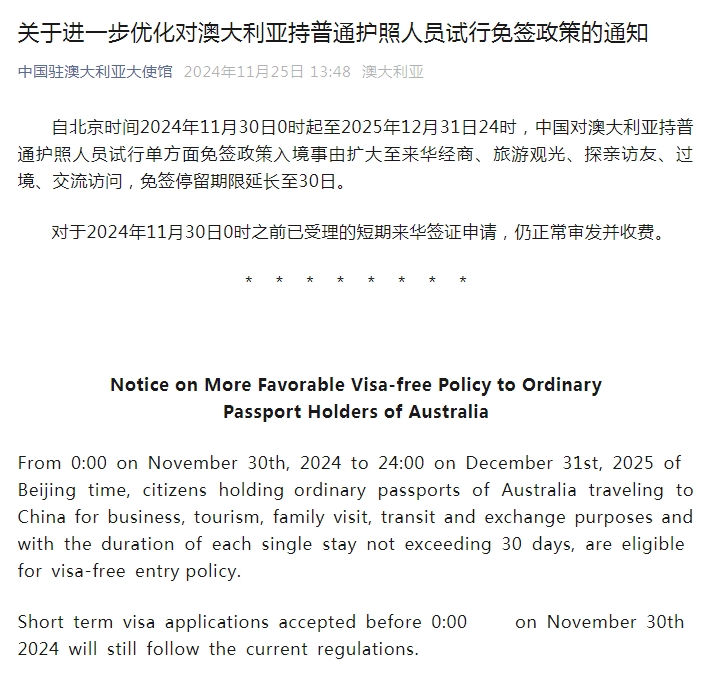 據(jù)“中國(guó)駐澳大利亞大使館”微信公眾號(hào)消息,自北京時(shí)間2024年11月30日0時(shí)起至2025年12月31日24時(shí),中國(guó)對(duì)澳大利亞持普通護(hù)照人員試行單方面免簽政策入境事由擴(kuò)大至來華經(jīng)商、旅游觀光、探親訪友、過境、交流訪問,免簽停留期限延長(zhǎng)至30日。