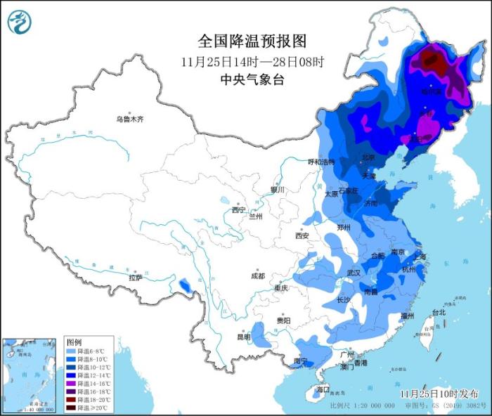 預(yù)計(jì),11月25日14時(shí)至11月27日14時(shí),內(nèi)蒙古中東部、華北、東北地區(qū)中南部、黃淮、江淮、江漢東部、江南北部等地將先后降溫6~10℃,其中,內(nèi)蒙古中部、華北北部、東北地區(qū)中南部等地部分地區(qū)降溫可達(dá)12℃以上。