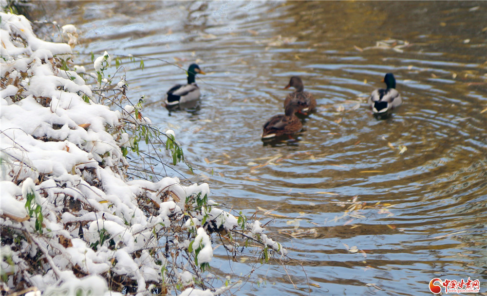 雪落湖畔,水鴨也“結(jié)伴”而游“賞”雪景。