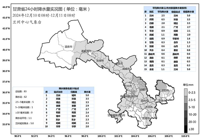 中國甘肅網(wǎng)12月11日訊(西北角·中國甘肅網(wǎng)記者 沈文剛)12月10日8時(shí)至12月11日8時(shí),全省共計(jì)62個縣區(qū)出現(xiàn)小雪,其中蘭州主城區(qū)出現(xiàn)大雪,慶陽北部、白銀中部和北部、臨夏西南部出現(xiàn)中雪。較大降水量出現(xiàn)在蘭州本站5.0mm、靖遠(yuǎn)3.5mm、環(huán)縣3.5mm、景泰2.9mm、廣河2.7mm。