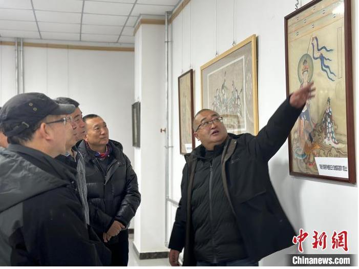 12月17日,由蘭州市七里河區(qū)委宣傳部、七里河區(qū)文體旅局聯(lián)合舉辦的“大漠孤陽映彩霞 敦煌神韻美如畫”新時代文明實踐主題活動暨敦煌巖彩畫書畫藝術(shù)展拉開帷幕。圖為展覽組織者為參觀者講解展出的作品。楊娜 攝