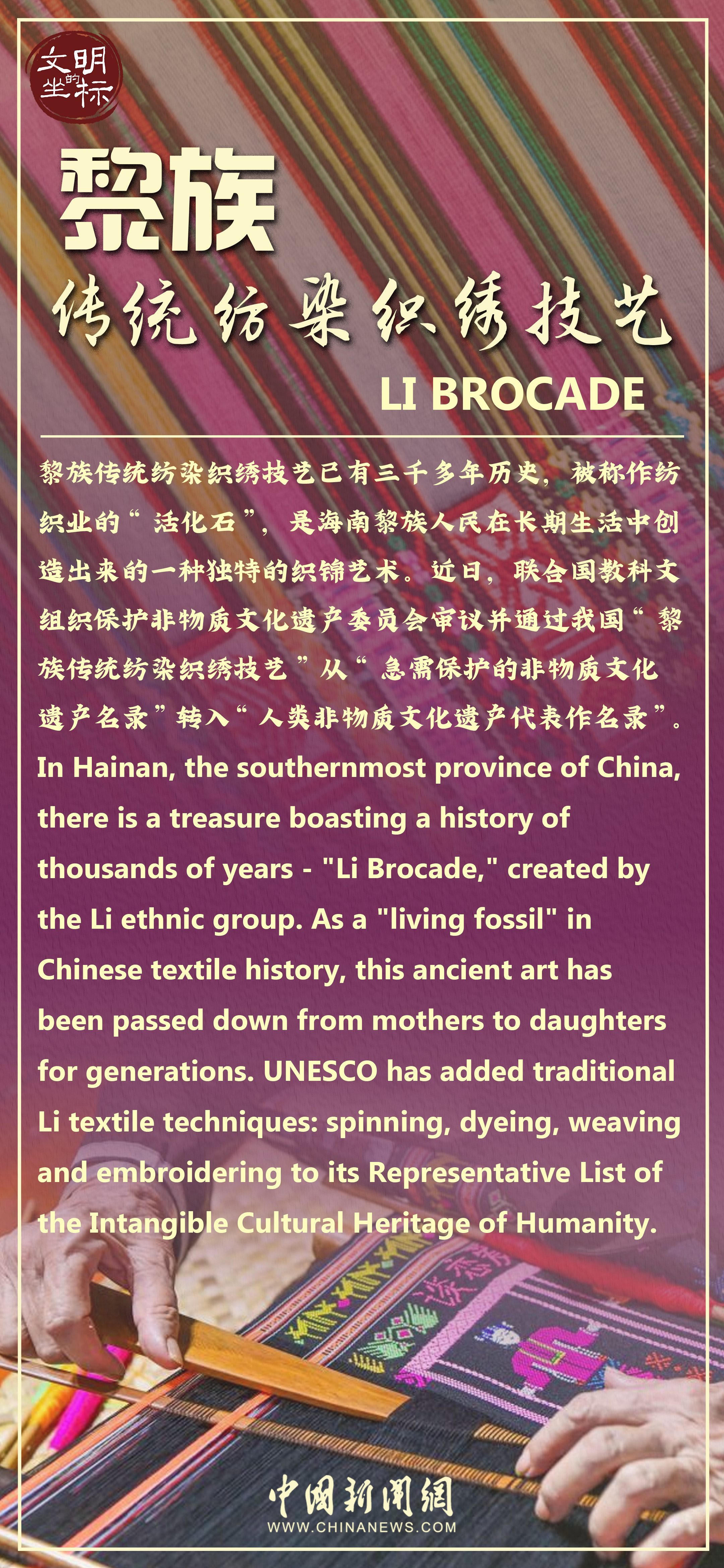 日前,黎族傳統(tǒng)紡染織繡技藝從聯(lián)合國教科文組織“急需保護(hù)的非物質(zhì)文化遺產(chǎn)名錄”轉(zhuǎn)入“人類非物質(zhì)文化遺產(chǎn)代表作名錄”,引發(fā)關(guān)注。黎族傳統(tǒng)紡染織繡技藝已有三千多年歷史,被稱作紡織業(yè)的“活化石”。對(duì)于沒有創(chuàng)造文字的黎族,黎錦像是一本“史書”,寫就了這個(gè)民族的文化和智慧。早在新石器時(shí)代,海南島上的黎族先民已會(huì)使用工具制作繩索或絲線。西漢時(shí)期,已織造出精美的“廣幅布”。至宋代,黎族的紡織達(dá)到很高水平。元代,黎族紡織工藝已傳至全國。黎族傳統(tǒng)紡染織繡技藝有麻織、棉織、織錦、印染(包括扎染)、刺繡、龍被等品種,以色彩鮮艷、圖案多樣、工藝精湛而聞名。如今,古老黎錦正穿越歷史長河,以時(shí)尚化、潮流化、年輕化的設(shè)計(jì)形態(tài)融入現(xiàn)代日常生活。