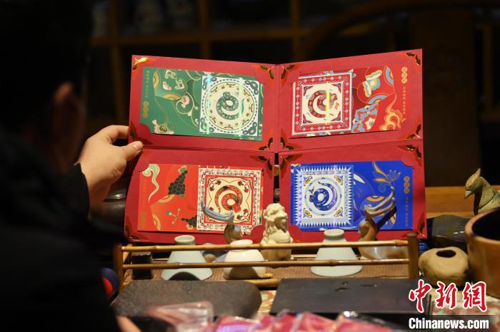 1月10日,在甘肅省敦煌市敦煌畫院內(nèi),游人參觀由敦煌畫院設(shè)計授權(quán)的中國郵政《敦煌福蛇》極限型明信片。中國郵政《敦煌福蛇》極限型明信片從敦煌壁畫里的藻井汲取靈感,集合敦煌紋樣、民藝剪紙等中國傳統(tǒng)藝術(shù)內(nèi)容,以春萌蛇、夏長蛇、秋實蛇、冬藏蛇對應著四季祝福。中新社記者 李亞龍 攝