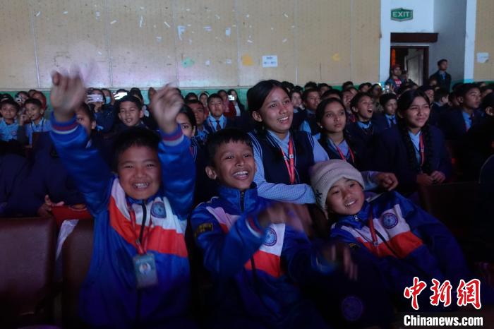2月20日,中尼跨國新春文藝晚會在尼泊爾博克拉舉行,尼泊爾學生在聽到博克拉國際機場開通首條定期國際航線時歡呼雀躍。 中新社記者 崔楠 攝