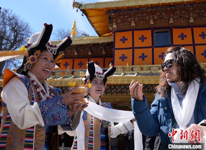 2月20日,由西藏自治區(qū)文化和旅游廳舉辦的2025年香港至拉薩航班首航旅行團(tuán)歡迎儀式在羅布林卡舉行。來自香港的游客將前往布達(dá)拉宮、大昭寺等地,開啟冬游西藏旅途。2月19日,拉薩至香港的首條地區(qū)航線正式開通。航線的開通,更加便捷了兩地居民的出行,也將進(jìn)一步促進(jìn)兩地在旅游、文化、經(jīng)貿(mào)等領(lǐng)域的交流與合作。圖為歡迎儀式現(xiàn)場(chǎng),工作人員向香港游客敬獻(xiàn)青稞酒。中新社記者 李林 攝