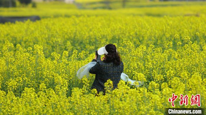 近日,云南省騰沖市界頭鎮(zhèn)成片的油菜花盛開,吸引不少游客前來觀光。金黃的油菜花海與遠處白墻黛瓦的村落相映成趣,共同繪就一幅寫意的水墨畫。圖為游客拍攝油菜花田。趙輝  攝