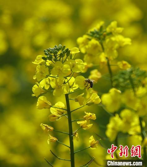 近日,云南省騰沖市界頭鎮(zhèn)成片的油菜花盛開,吸引不少游客前來觀光。金黃的油菜花海與遠處白墻黛瓦的村落相映成趣,共同繪就一幅寫意的水墨畫。圖為油菜花吸引蜜蜂采蜜。趙輝  攝