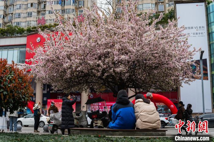 圖為3月16日,棠湖公園正大門處,垂絲海棠盛開,市民在此拍攝寫真照。韓金雨 攝