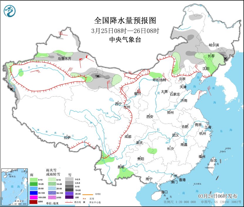 3月25日08時至26日08時,新疆沿天山地區(qū)、內(nèi)蒙古西北部和東部、吉林大部、甘肅河西等地部分地區(qū)有小到中雪或雨夾雪,其中,吉林東部、新疆南疆西部山區(qū)、甘肅北部等地部分地區(qū)有大雪(5~8毫米)。新疆伊犁河谷、內(nèi)蒙古中部、吉林中部、遼寧東部、河北北部、湖南西部、貴州東北部、云南西北部和東南部等地部分地區(qū)有小雨。內(nèi)蒙古中西部、遼寧西部、山東半島、新疆東部、甘肅北部等地部分地區(qū)有4~6級風,新疆山口地區(qū)陣風風力8~9級。內(nèi)蒙古中西部、甘肅河西、寧夏等地部分地區(qū)有揚沙。