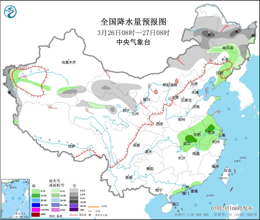 3月26日08時至27日08時,內(nèi)蒙古東部、黑龍江大部、吉林東部、新疆南疆西部山區(qū)、甘肅河西、青海北部等地部分地區(qū)有小到中雪或雨夾雪,其中,內(nèi)蒙古東北部、黑龍江中東部、新疆南疆西部山區(qū)等地部分地區(qū)有大雪(5~9毫米)。吉林中部、遼寧東部、江淮大部、江漢東部、江南北部、廣東南部沿海等地部分地區(qū)有小雨,其中,湖北東部、安徽中部、江蘇西南部等地部分地區(qū)有中雨。內(nèi)蒙古大部、西北地區(qū)中東部、華北大部、東北地區(qū)西部、新疆南疆盆地等地部分地區(qū)有4~6級風。內(nèi)蒙古中西部、寧夏等地部分地區(qū)有揚沙。