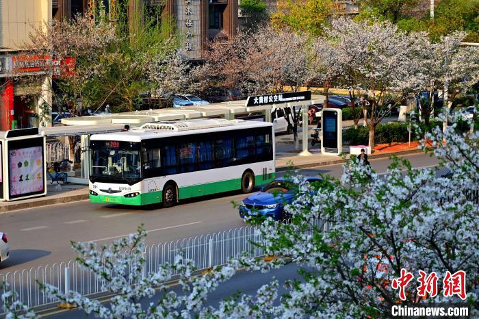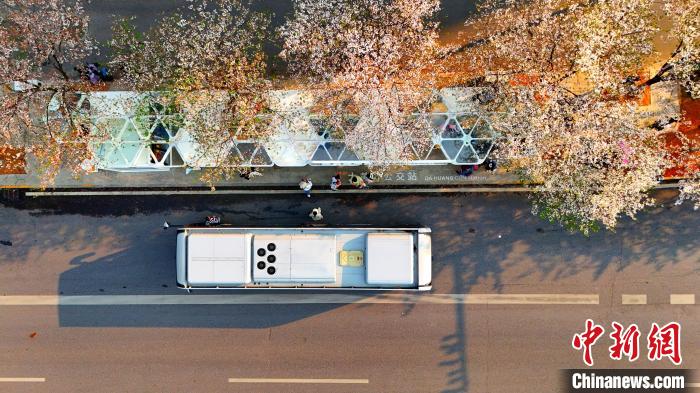 3月26日,被譽(yù)為武漢“最美櫻花車(chē)站”的珞喻東路大黃村公交站櫻花盛放。經(jīng)過(guò)改造的大黃村公交站,新增了自助售貨機(jī)、衛(wèi)生間、共享充電寶等便民設(shè)施,煥然一新的科技智慧站臺(tái)與粉白如霞的櫻花相映生輝。微風(fēng)吹過(guò),櫻花花瓣浪漫飄零,吸引不少市民游客觀(guān)賞“打卡”。圖為公交車(chē)在珞喻東路大黃村公交站停留。(無(wú)人機(jī)照片)劉康 攝