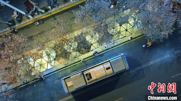 圖為夜間的珞喻東路大黃村公交站,櫻花在光影中呈現(xiàn)別樣魅力。(無(wú)人機(jī)照片)周星亮 攝