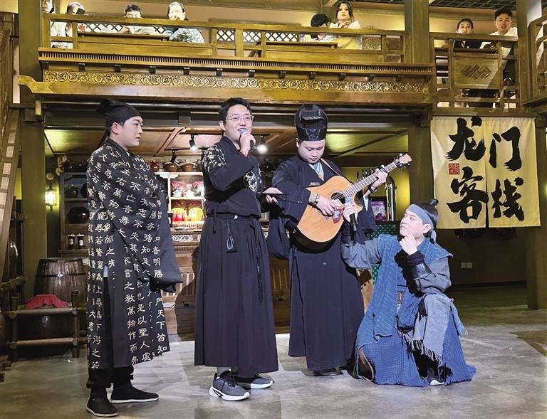 “諸位小友近來(lái)可好?”“好!”在街區(qū),NPC們與游客的互動(dòng)成為一大亮點(diǎn)。為了讓游客更好地沉浸其中,街區(qū)里的“蘭裳閣”專門(mén)提供服裝出租和妝造設(shè)計(jì)服務(wù)。游客們?cè)谶@里換上漢服、做好造型,“穿越”成古人與NPC們共同沉浸在這場(chǎng)歷史旅行中。張偉彥在“龍門(mén)客棧”工作快半年了,飾演店小二馬一刀。他對(duì)角色有著自己的理解:“導(dǎo)演讓我演店小二,大家印象里店小二都是機(jī)靈、腿腳快的。但我演的這個(gè)店小二帶著江湖氣息,他藏在龍門(mén)客棧,其實(shí)是個(gè)刀客,在這里打工是為了打探消息,畢竟龍門(mén)客??墒墙⒌木奂?。”記者走在街區(qū),時(shí)不時(shí)就能看到他拿著草帽,熱情地招呼游客玩接帽子游戲。遇到靦腆不敢嘗試的游客,他也會(huì)不斷鼓勵(lì),有時(shí)候碰上外國(guó)游客,他還隨口說(shuō)幾句英語(yǔ)與其互動(dòng)。