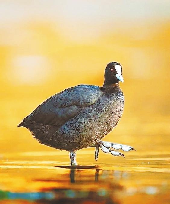 白骨頂又被喚作骨頂雞,卻是鶴類的遠親。它靜浮水面時,額前一抹象牙白,宛若遺落人間的墨玉鎮(zhèn)紙。這枚額甲實為特化的角質(zhì)層,是為了保護頭部的盔胄?;野咨陌牾肴缪┑匮グ惆洪g,劃開水藻時泛起粼粼波光——這身黑羽配雪蹼的穿搭,竟比時裝周的極簡主義更先鋒。當(dāng)它們列隊掠過蘆葦蕩,水淼勾勒的剪影里,仿佛在繪制著秋天的信箋。