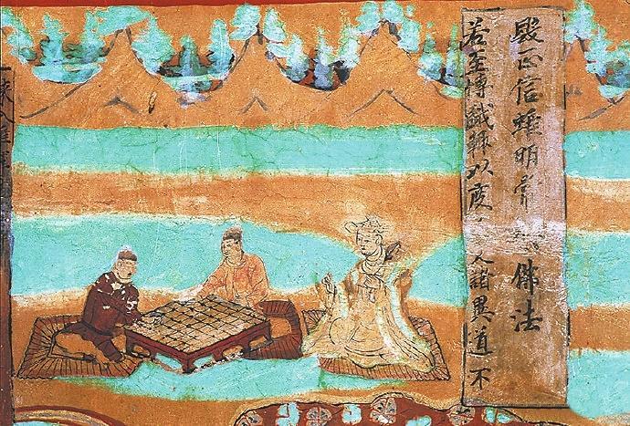 在敦煌壁畫中有關對弈的內容較多。在莫高窟第454窟、第7窟壁畫中都有“弈棋圖”。兩幅圖的畫面有不少類似的地方:一是畫師較為突出棋盤的位置,兩幅壁畫中的棋盤都居中且形制相對巨大;二是畫面上的人物均為三人,兩人對弈,一人觀戰(zhàn),“觀棋不語真君子”;三是對弈者身后的景色都是天朗氣清、遠山含黛。據說,一天,北宋大文豪蘇東坡與摯友黃庭堅正在松樹底下弈棋。一陣風吹來,松果掉進棋盤。蘇東坡隨即吟道:“松下圍棋,松子每隨棋子落。”黃庭堅馬上回答道:“柳邊垂釣,柳絲常伴釣絲懸。”雅趣十足。其實,棋局里的一動一靜、一招一式無不需要謹小慎微、穩(wěn)扎穩(wěn)打。而對弈時的當斷則斷、示假隱真、有效合作等戰(zhàn)術不僅是對弈的智慧,也是人生的哲理吧。
