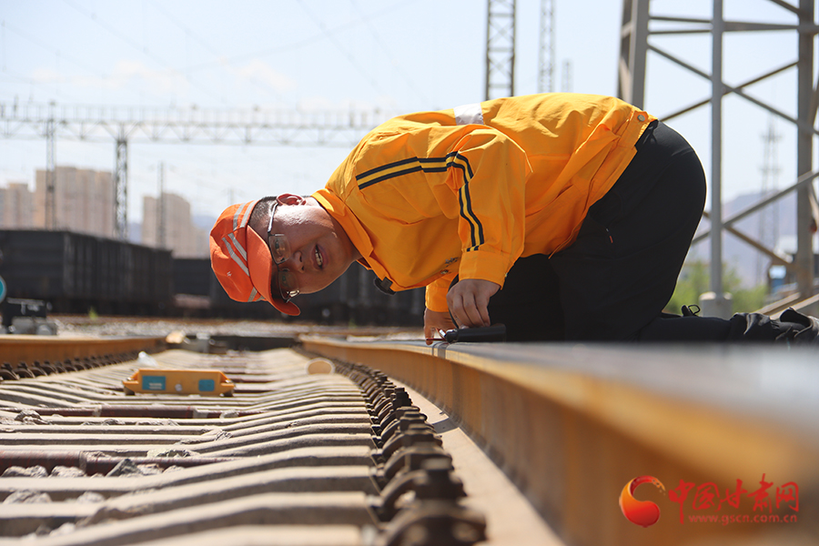 “樊工長(zhǎng),測(cè)一下此時(shí)的軌溫是多少?”到達(dá)蘭州北編組站下行到達(dá)場(chǎng)后,劉亞雄一邊擦拭著額頭不斷滾落的汗珠,一邊向樊勇喊道。樊勇熟練地將軌溫計(jì)貼在軌腰上,金屬表盤上的指針猶如上了發(fā)條,瞬間直飚半圈定格在54℃!