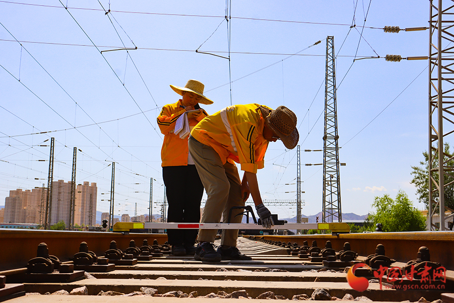 他們五人一組,兩人拿著檢查錘左右開(kāi)弓,敲擊檢查扣件和連接零件,通過(guò)聲響辨別扣件松緊;一人弓著腰,每隔三四根枕木就俯身用道尺測(cè)量軌距,一人記錄測(cè)量數(shù)據(jù)。劉亞雄則貓著腰穿梭在股道間,時(shí)而跨在鋼軌上彎腰看方向,時(shí)而雙手扶在滾燙的鋼軌上,趴在股道里線路查看高低。
