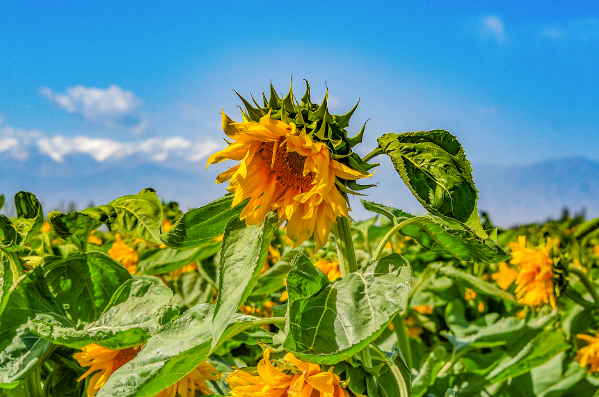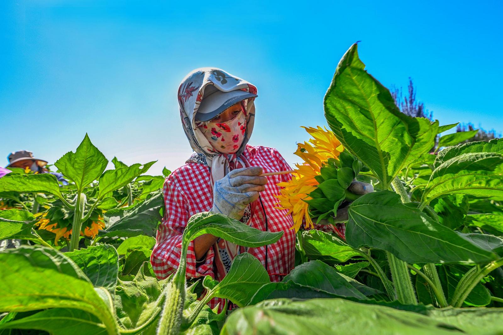 中國(guó)甘肅網(wǎng)7月14日訊 據(jù)嘉峪關(guān)日?qǐng)?bào)報(bào)道(融媒體中心記者 李巍 攝)近日,嘉峪關(guān)市新城鎮(zhèn)野麻灣村“千畝”制種向日葵迎來(lái)盛花期,朵朵花盤匯聚成金色花海,放眼望去,與雪山相融、與藍(lán)天相接,如詩(shī)如畫,美不勝收。