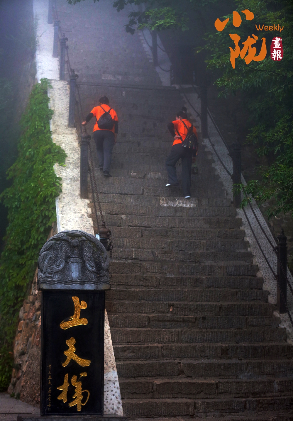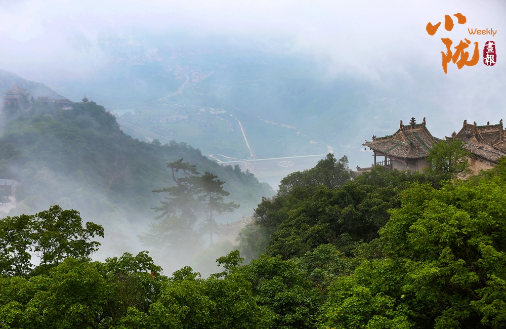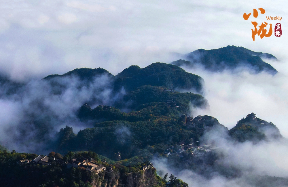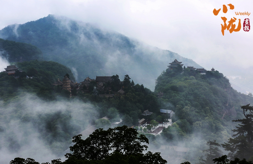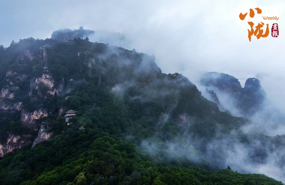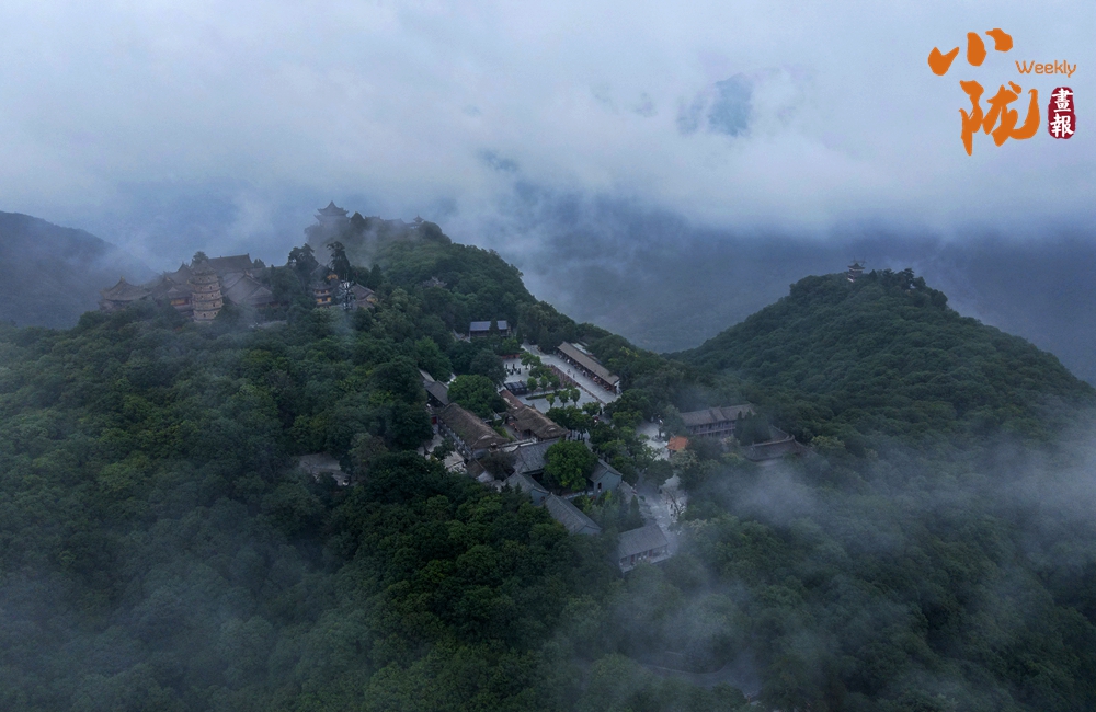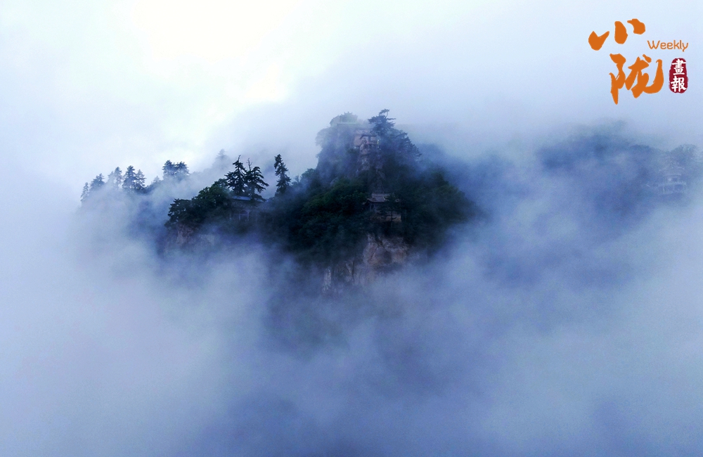云霧繚繞,山水與寺廟隱現(xiàn),營(yíng)造出神秘且令人向往的視覺效果。站在半山腰,背靠懸崖,深邃不可見底,不禁生出“山登絕頂我為峰”的豪情。然而,世間萬物,瞬息萬變,是否成為峰巔之巔又何妨?