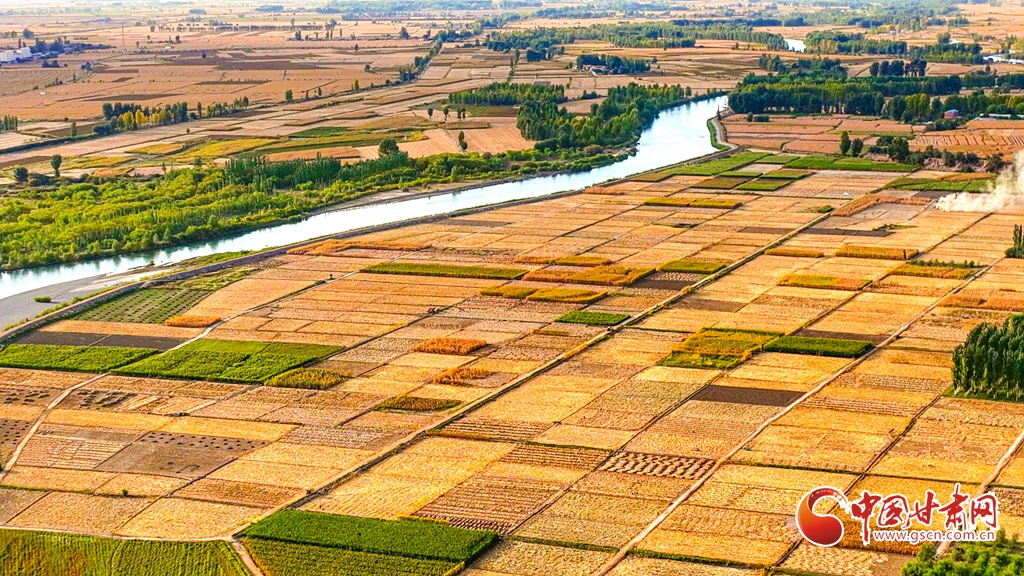 9月26日傍晚,夕陽(yáng)映照下的黑河張掖臨澤縣鴨暖鎮(zhèn)段,蜿蜒流淌的河水與兩岸鋪滿金色的大地交相輝映,盡顯盎然生機(jī),共同勾勒出一幅金秋豐收的壯美畫卷。