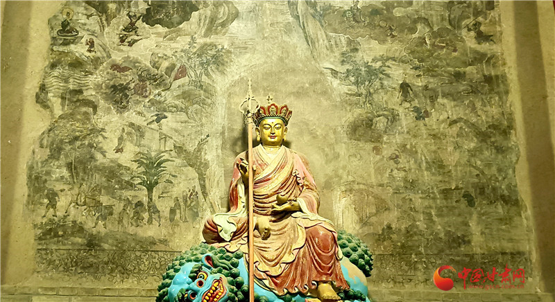這幅壁畫繪于大佛殿內(nèi)大佛身后墻壁,色彩雖已斑駁,卻仍難掩其藝術價值,是大佛殿內(nèi)時代較早、藝術水準極高的作品。它距地面高1.55米,上下兩端用墨線勾出邊欄,邊欄內(nèi)繪纏枝牡丹點綴;《西游記》故事圖居于正中,殘長約4.4米,殘高約2.9米,面積約12.7平方米,壁畫前今塑有地藏王菩薩像一尊。壁畫由“取水子母河”“道昧放心猿”“大戰(zhàn)紅孩兒”等多個獨立故事組成,畫面里險山怪石、古木溪水、云霧火海錯落交織,而師徒四人的分工設定始終清晰:豬八戒挑行李、沙僧牽馬、孫悟空持金箍棒護送,這份“固定分工”讓豬八戒的勤勞形象貫穿全程。
