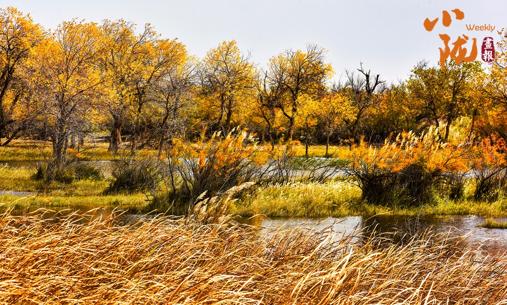 金色胡楊在陽光下泛著溫暖光澤,斑斕絢麗的蘆葦如金色絲帶點綴荒漠,與碧綠河水、湛藍(lán)天空構(gòu)成濃墨重彩的秋日圖景。