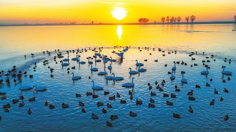 11月20日,甘肅金塔縣芨芨水庫(kù)濕地,遷徙越冬的白天鵝、赤麻鴨成群翔集湖面,成為初冬一道靚麗風(fēng)景。近年來(lái),金塔縣持續(xù)改善生態(tài)環(huán)境,加強(qiáng)濕地保護(hù)與修復(fù)工作,為水鳥(niǎo)提供了理想的棲息場(chǎng)所,每年在此棲息的候鳥(niǎo)多達(dá)數(shù)萬(wàn)只。 奔流新聞·蘭州晨報(bào)通訊員 曹紅祖 李鵬 段金龍 攝