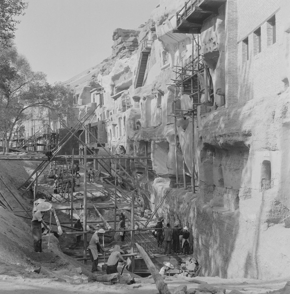 敦煌研究院工作人員對(duì)莫高窟部分洞窟進(jìn)行加固施工(1964年7月8日攝)。新華社發(fā)