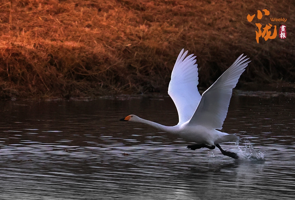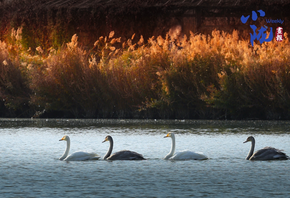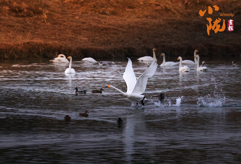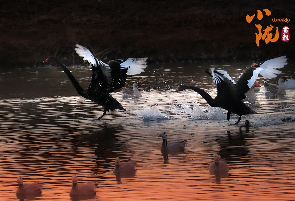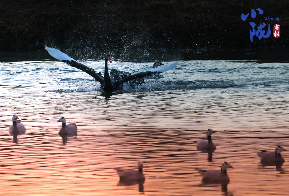 這里聚集了黑鸛、白鷺、鴛鴦、天鵝、赤麻鴨、灰雁等多種水鳥,它們在黃昏里愜意地游弋,或扎進水里捕魚,或相互追逐戲水的畫面,既震撼又溫柔,成為攝影愛好者和游人爭相追逐的“冬日奇景”。