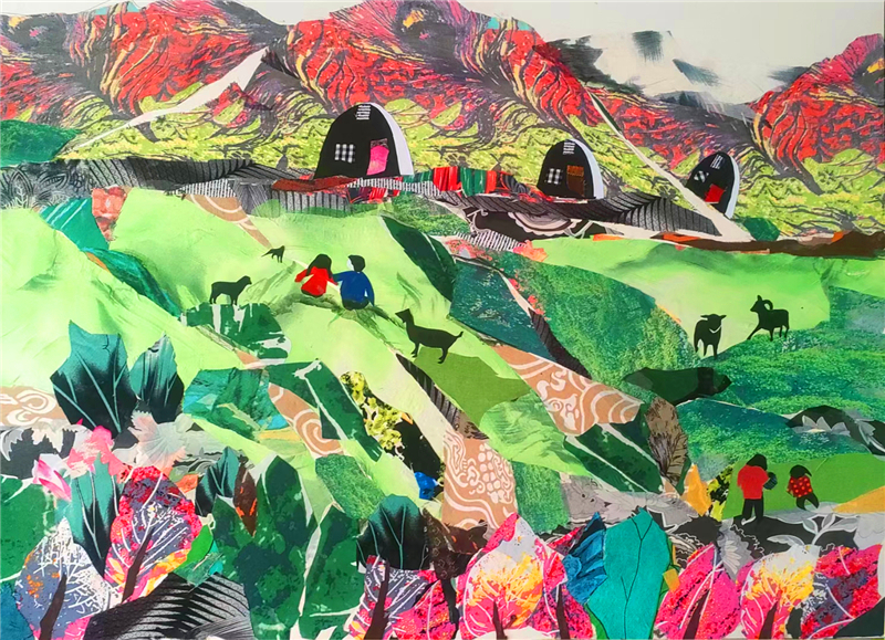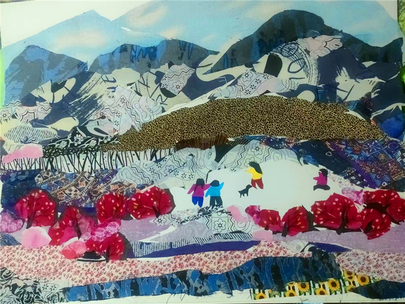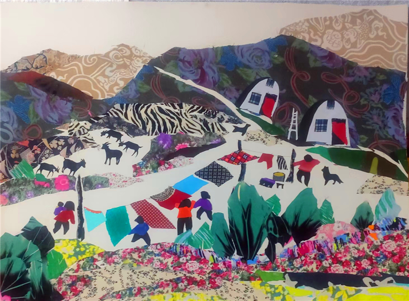 裁剪環(huán)節(jié)更見功力。她以“銳利”之心駕馭剪刀,根據(jù)畫面需求將碎布剪成不同形狀,有的需棱角分明,有的要圓潤柔和。粘貼時(shí),她摒棄簡單的粘合方式,采用傳統(tǒng)縫補(bǔ)與現(xiàn)代鑲嵌相結(jié)合的技法,讓布料與底板緊密貼合,既保證了作品的耐久性,又營造出自然的浮雕感。在《黃土風(fēng)情》布貼畫中,她用層層疊疊的碎布表現(xiàn)黃土高原的溝壑縱橫,用深淺不一的色塊勾勒窯洞的錯落有致,指尖翻飛間,碎布頭便有了筋骨與神韻。