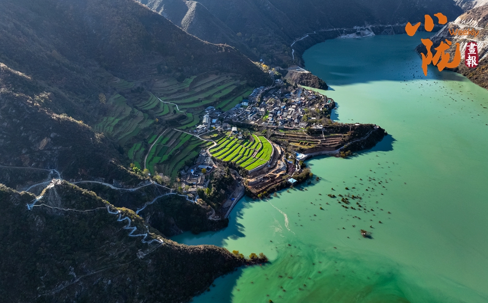 和煦的陽(yáng)光傾灑而下,白龍江凝結(jié)的冰面宛如一塊巨大的天然翡翠,溫潤(rùn)而晶瑩。它并非孤立存在,而是以一種寧?kù)o而包容的姿態(tài),溫柔地環(huán)繞著、守護(hù)著岸上那些升起炊煙的村舍。